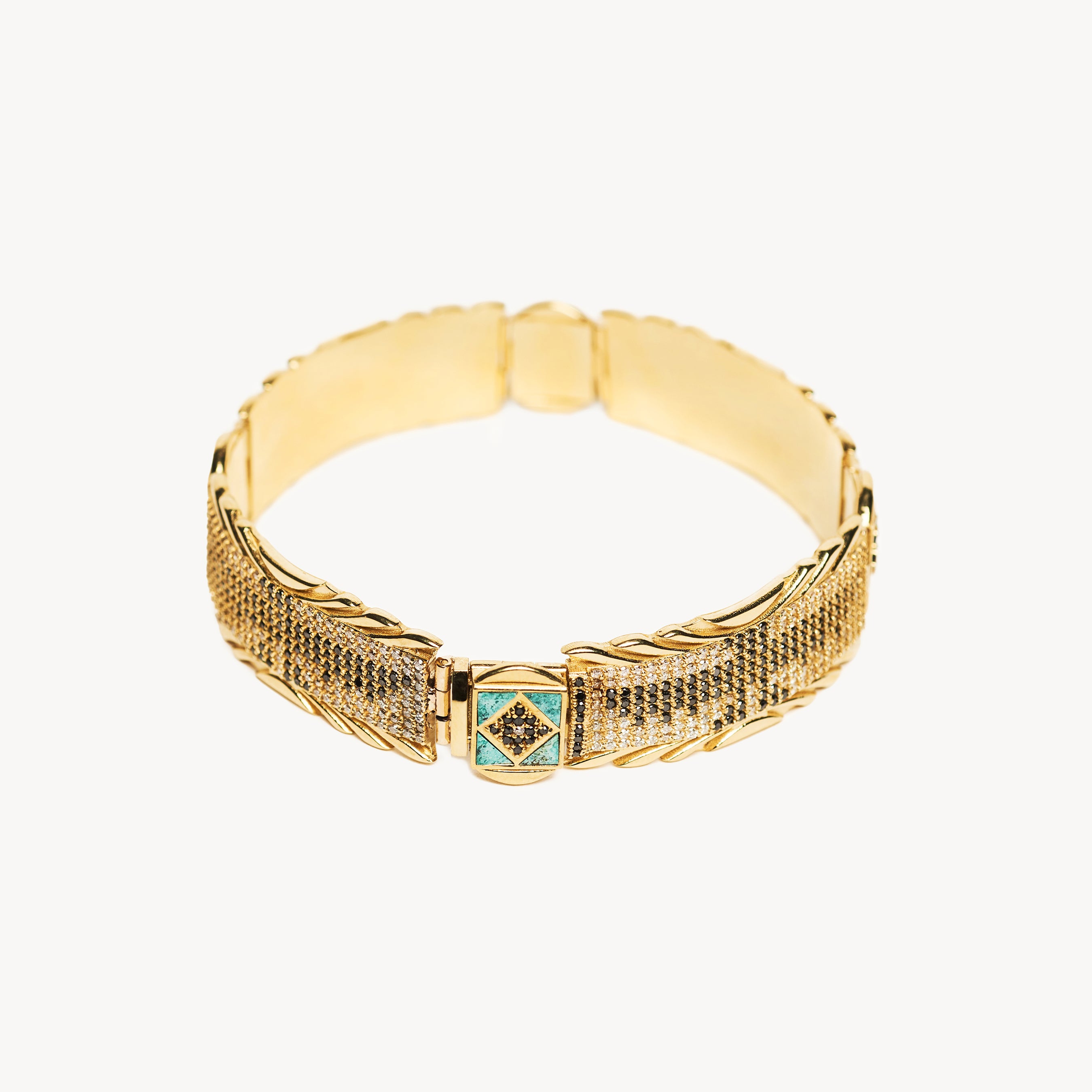 NATIVE AMERICAN THUNDERBIRD DIAMOND BRACELET: AN 18K SOLID GOLD PIECE ADORNED WITH 67G OF WHITE AND BLACK VVS DIAMONDS.